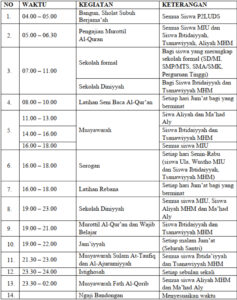 - Musyawarah kitab fath Al-qorib setiap malam senin untuk tingkatan wustho, ulya, ‘Aliyah dan Ma’had Aly;